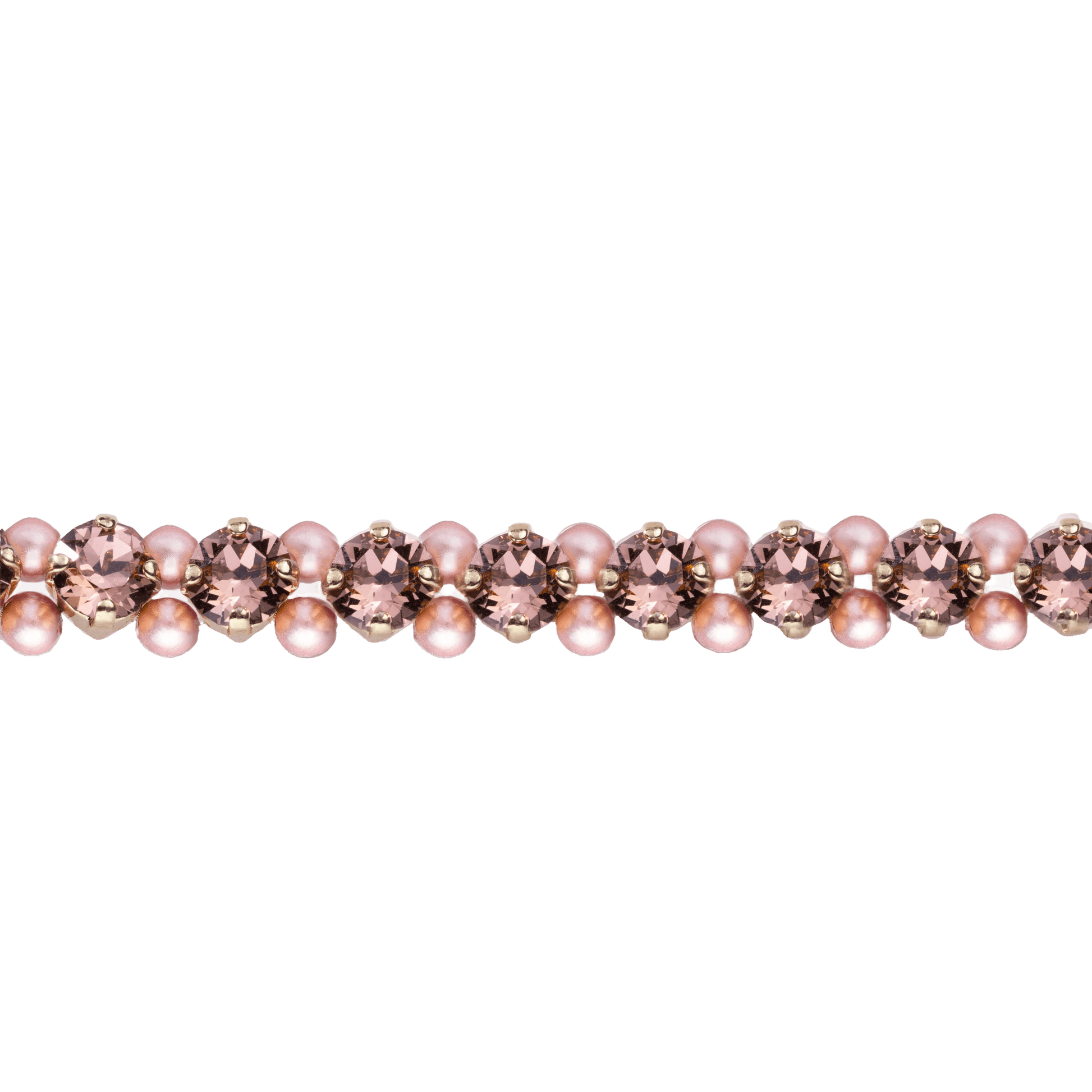 Smalks kristālu un pērļu pinums eleganti papildina tēlu. Labi izskatās kopā ar pulksteni.