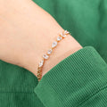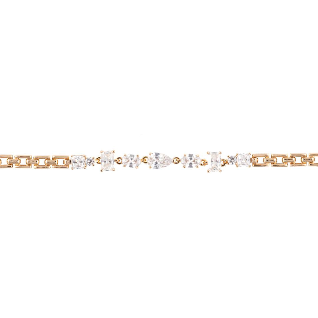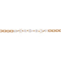 Rokas ķēdīte ar dažādu formu kristāliem, piešķirot tai izsmalcinātu un modernu izskatu. Rozā zelts sievišķīgi saskan ar kristāliem, padarot to par lielisku izvēli gan ikdienai, gan svinīgiem brīžiem.