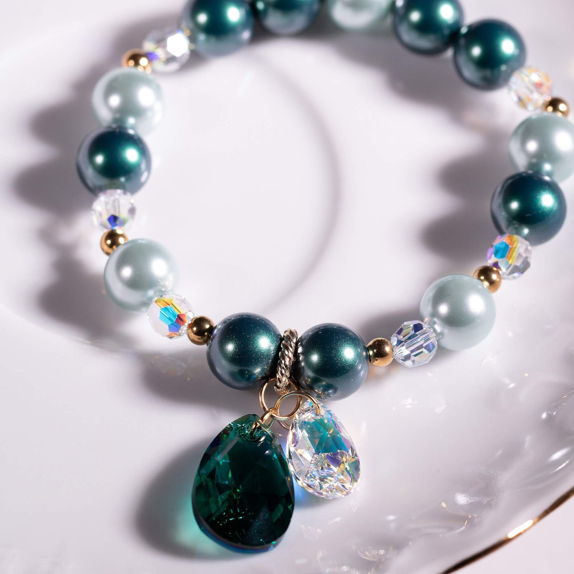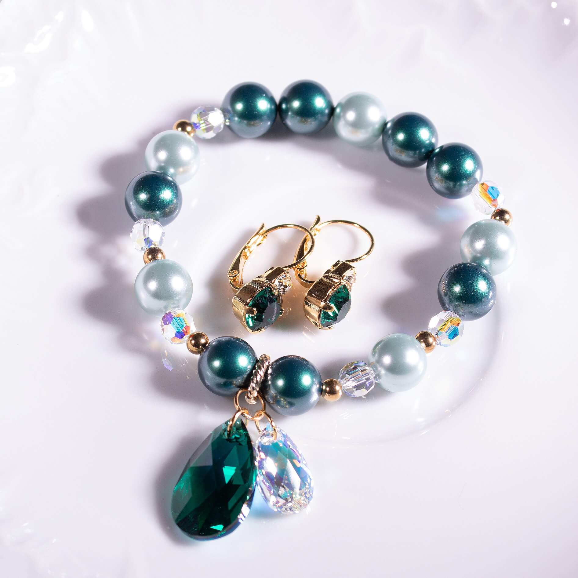 - Rokassprādze: pērļu diametrs 10mm, lāsīšu izmērs 16mm un 22mm, auskari: 8mm kristāli