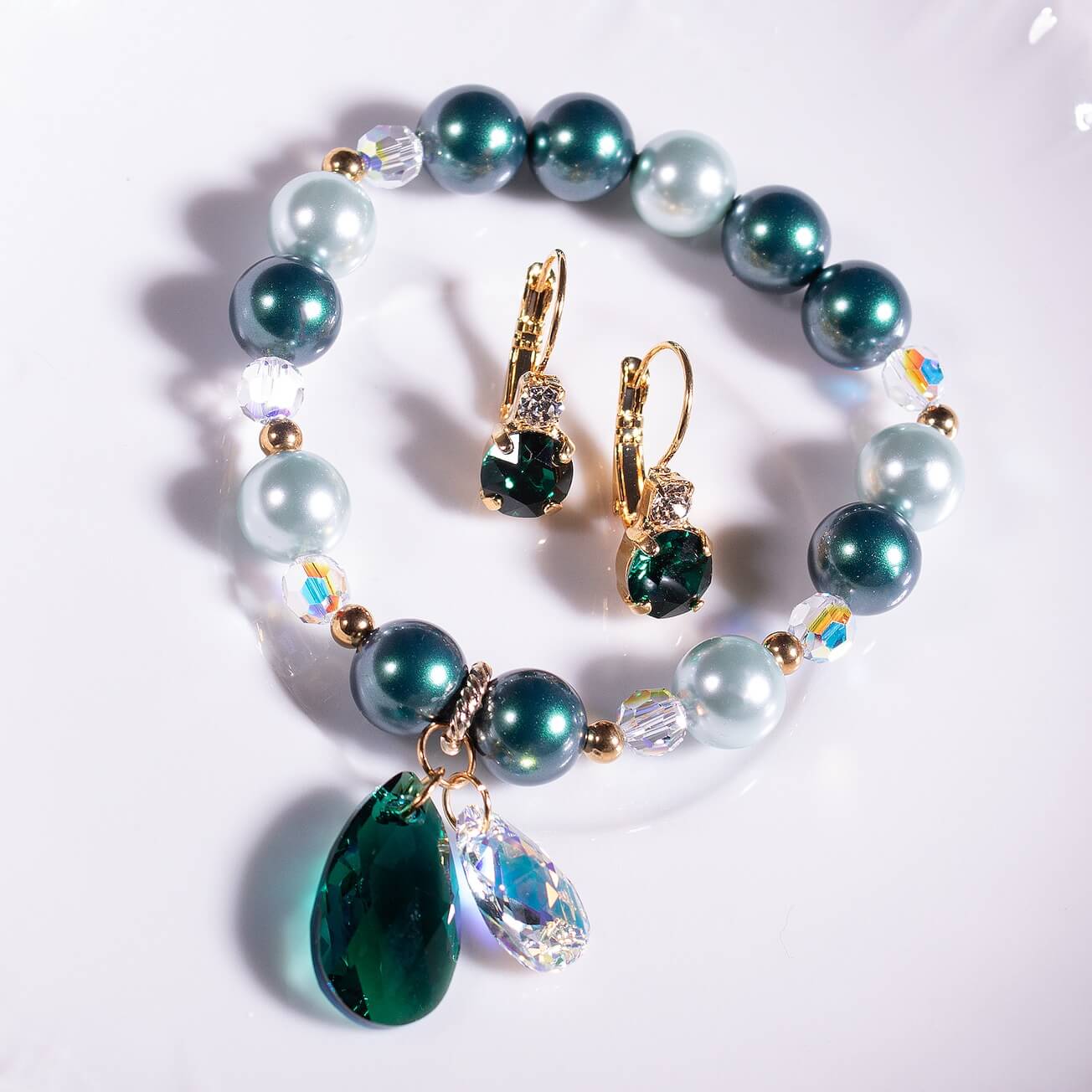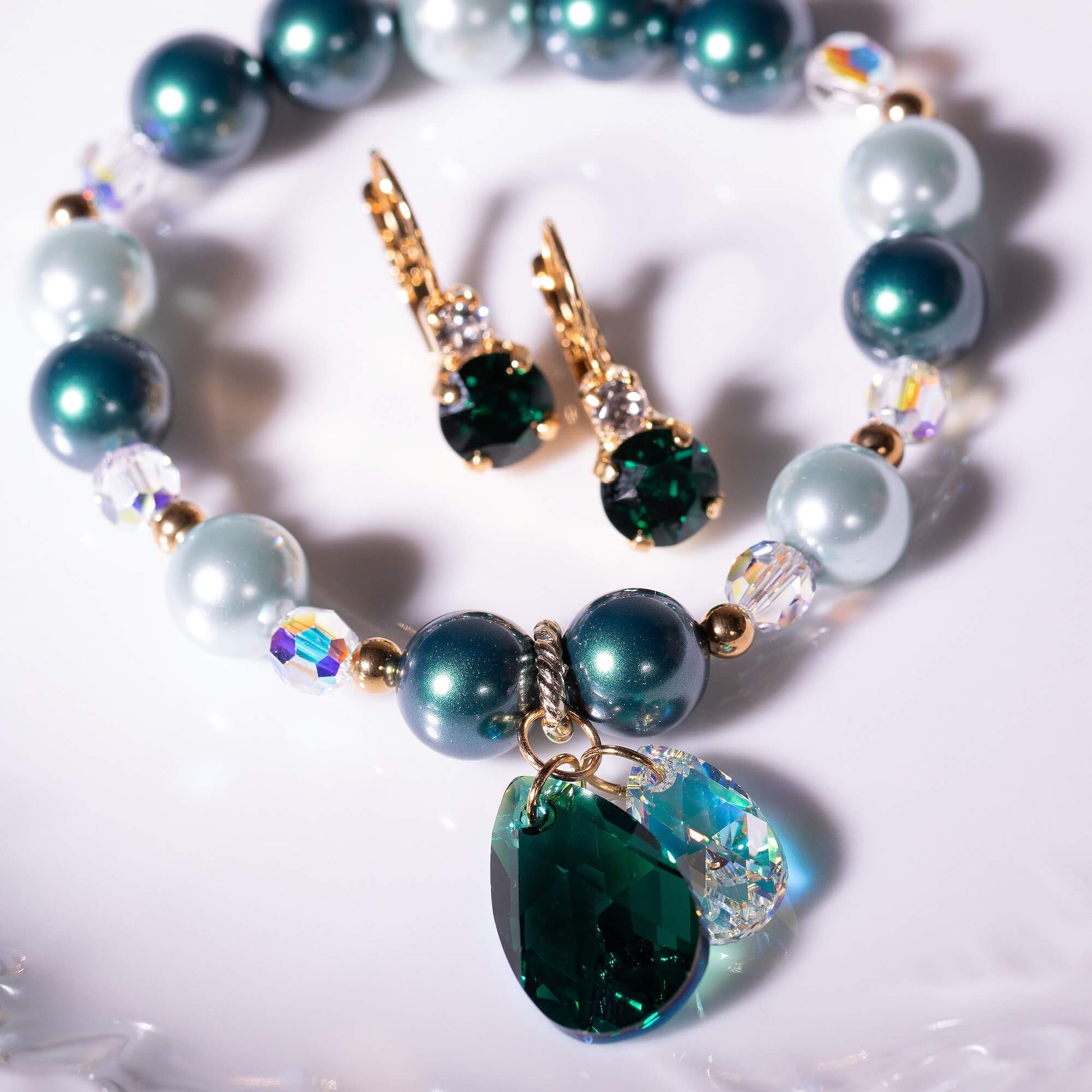 Grezna rokassprādze ar piekariņu un pieskaņoti kristālu auskari