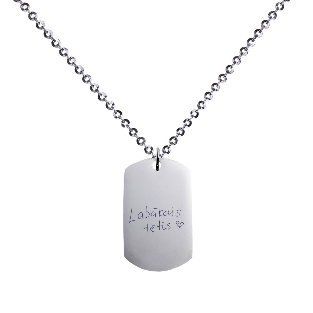 Iegravēsim jebkuru tekstu vai bildi 5 min laikā! Katra šāda ķēdīte būs unikāla un īpaša, jo kulona tekstu vai bildi var izvēlēties pēc saviem ieskatiem. Kulona priekšā var iegravēt vienu tekstu vai bildi, bet aizmugurē citu. Lieliska un īpaša dāvana vīrietim! Šāda veida rotas ir personisks un emocionāls dāvinājums vīrietim. Kulona materiāls ir nerūsējošais tērauds ar zelta pārklājumu vai sudraba pārklājumu, kas nodrošina rotas izturību un glītu izskatu.
