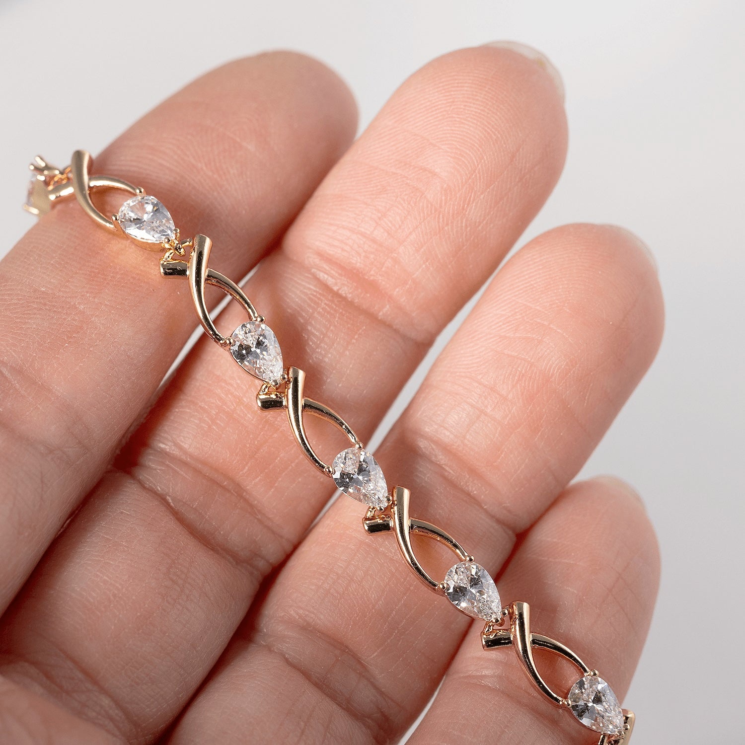 Kristālu un rozā zelta rokas ķēdīte JANA. Klasiska kombinācija, kas piestāvēs gan ikdienai, gan svētku reizēm.